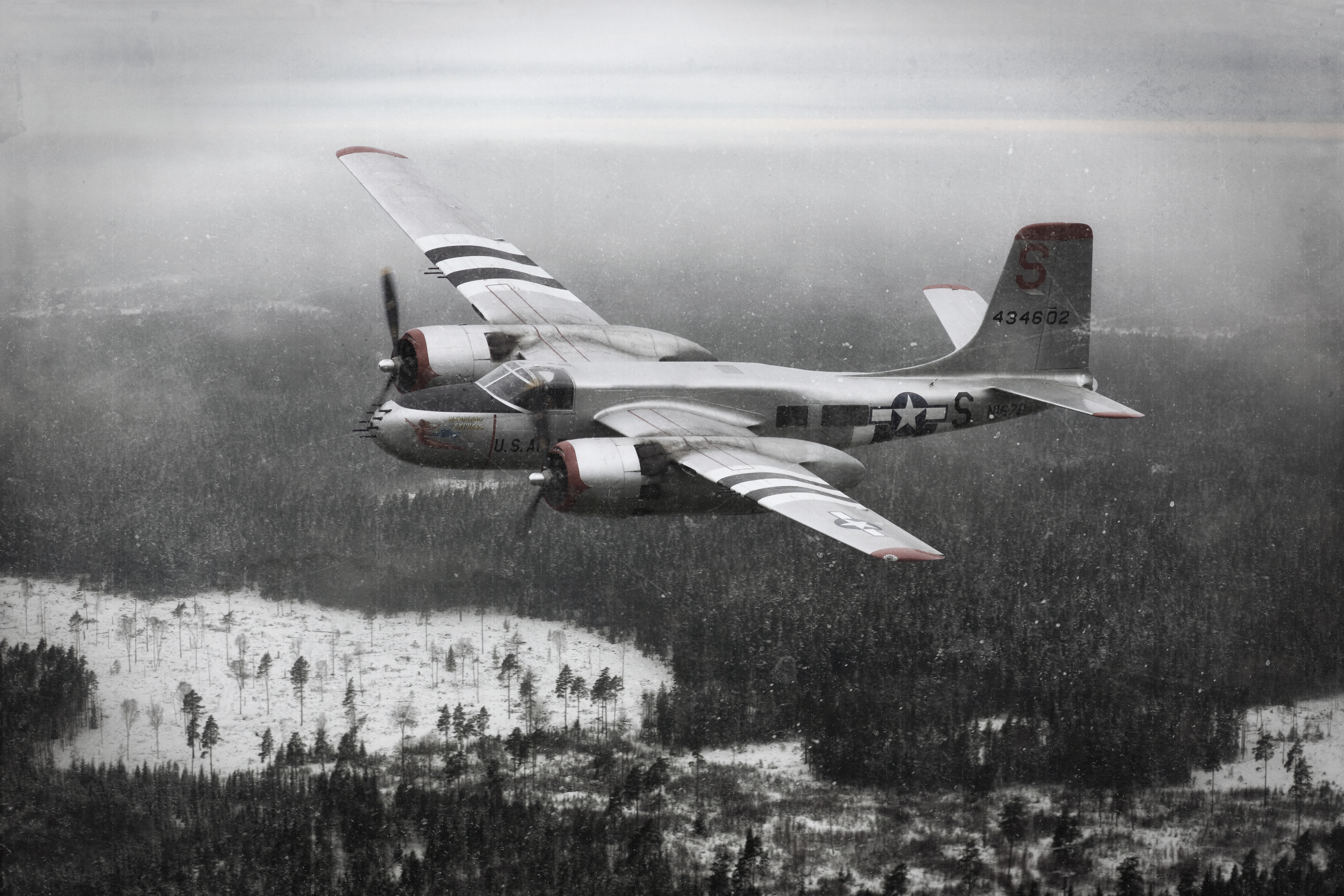 En Douglas Invader fångad på uppvisning i Västerås mot bakgrund tagen under inflygning till landning på Arlanda. Redigerat montage.