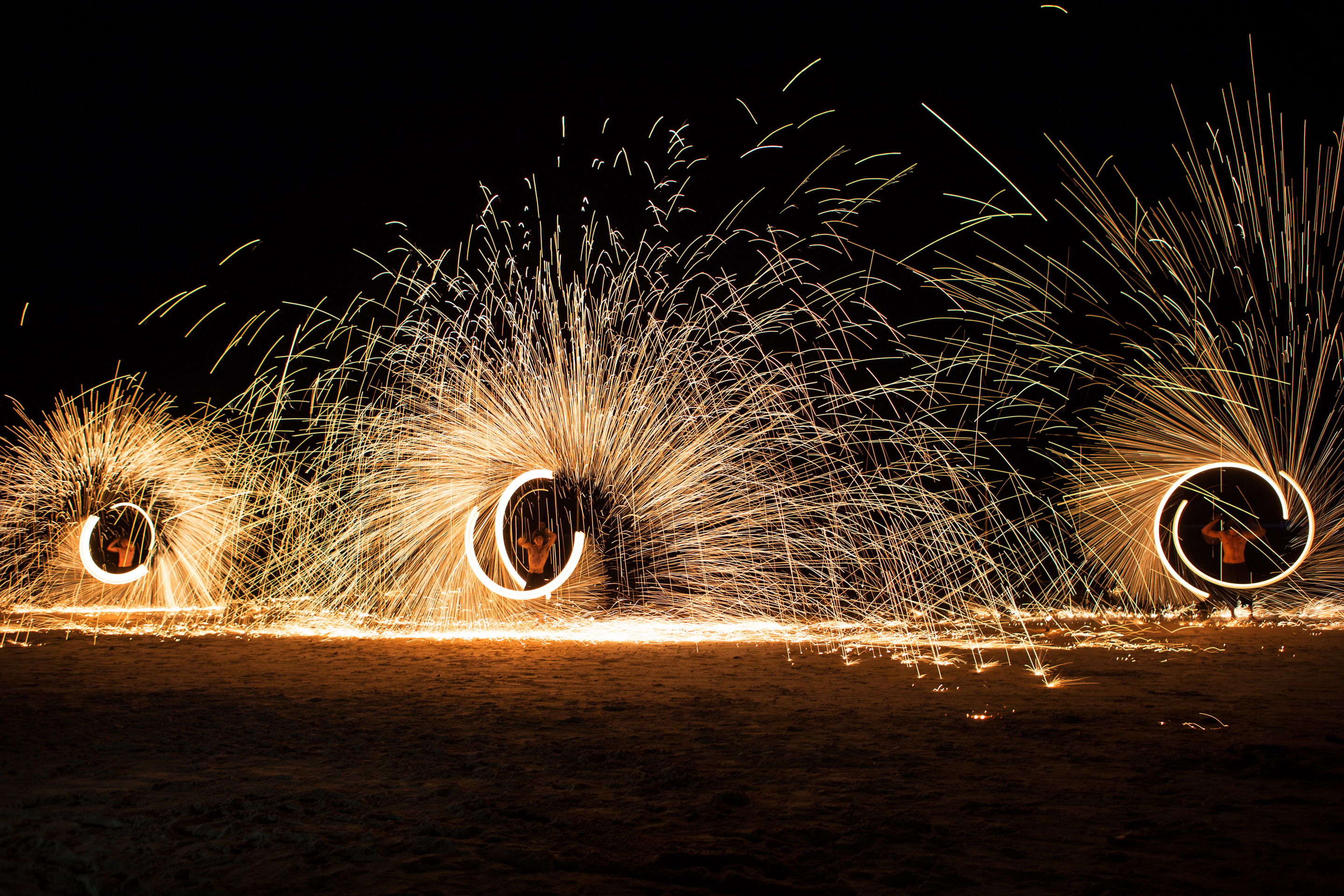 Tre eldkonstnärer i full färd med att sprida gnistor