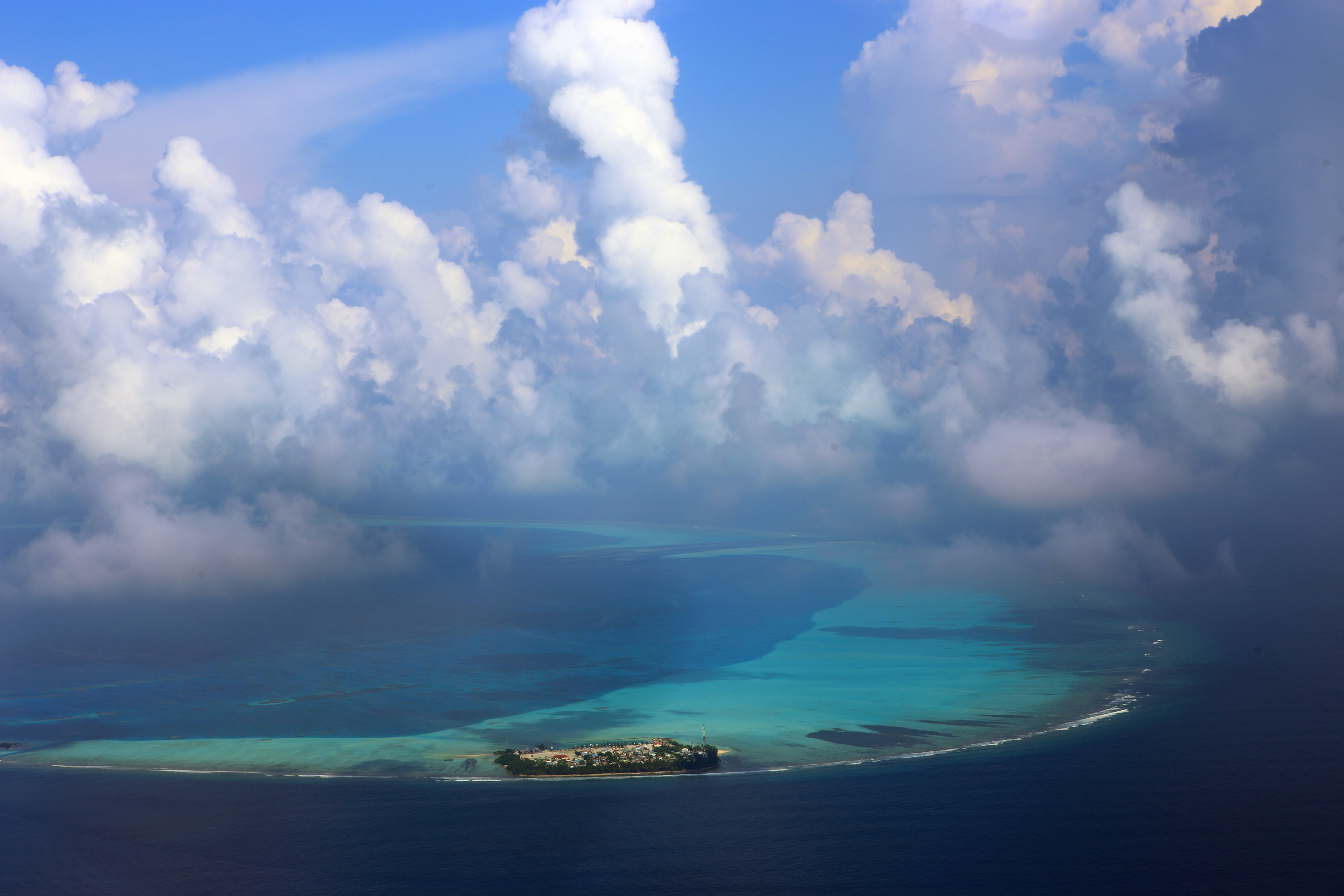 En atoll i öriket Maldiverna med en makalös uppvisning av dramatik av molnen i bakgrunden